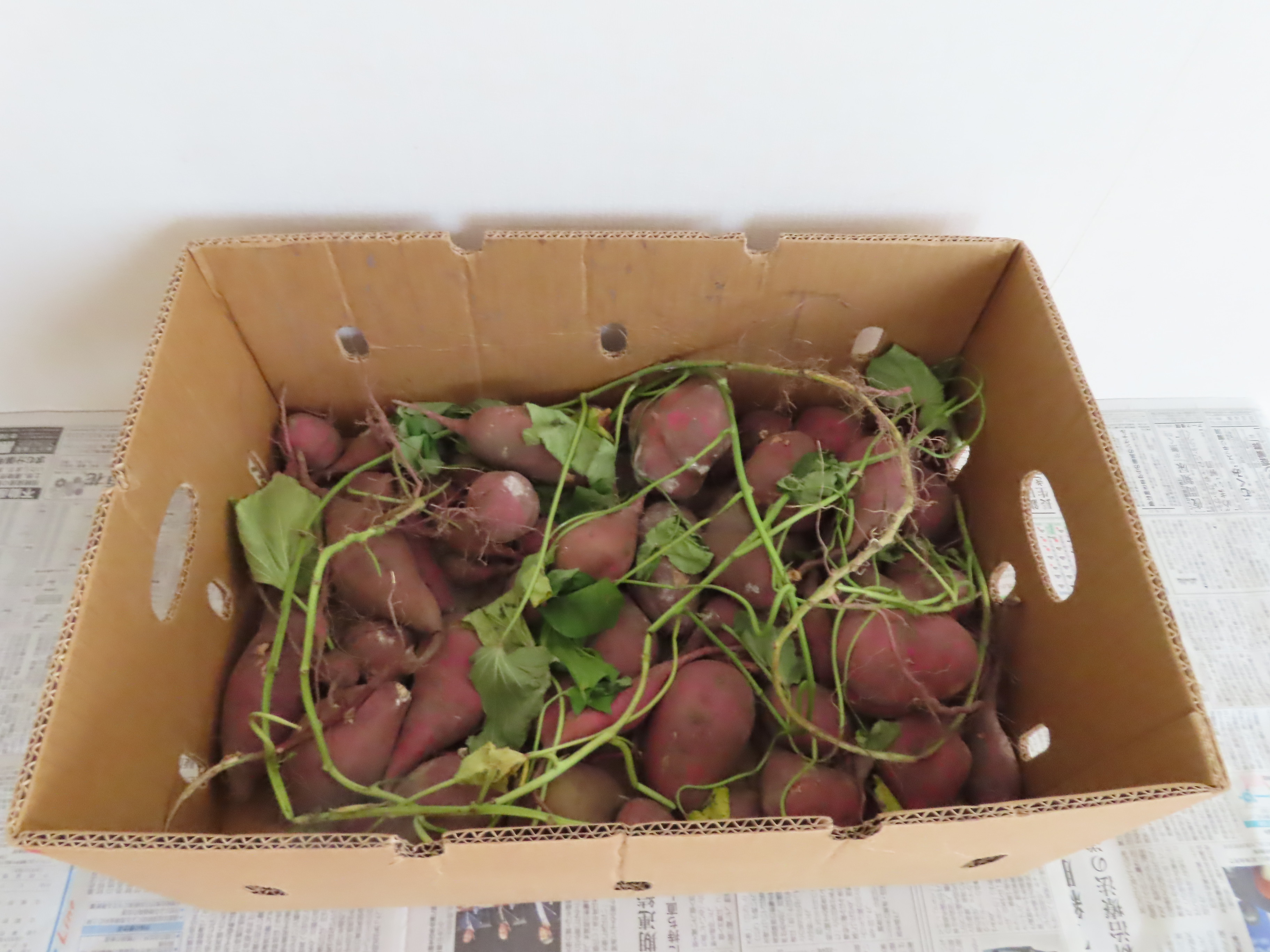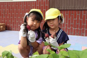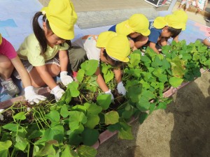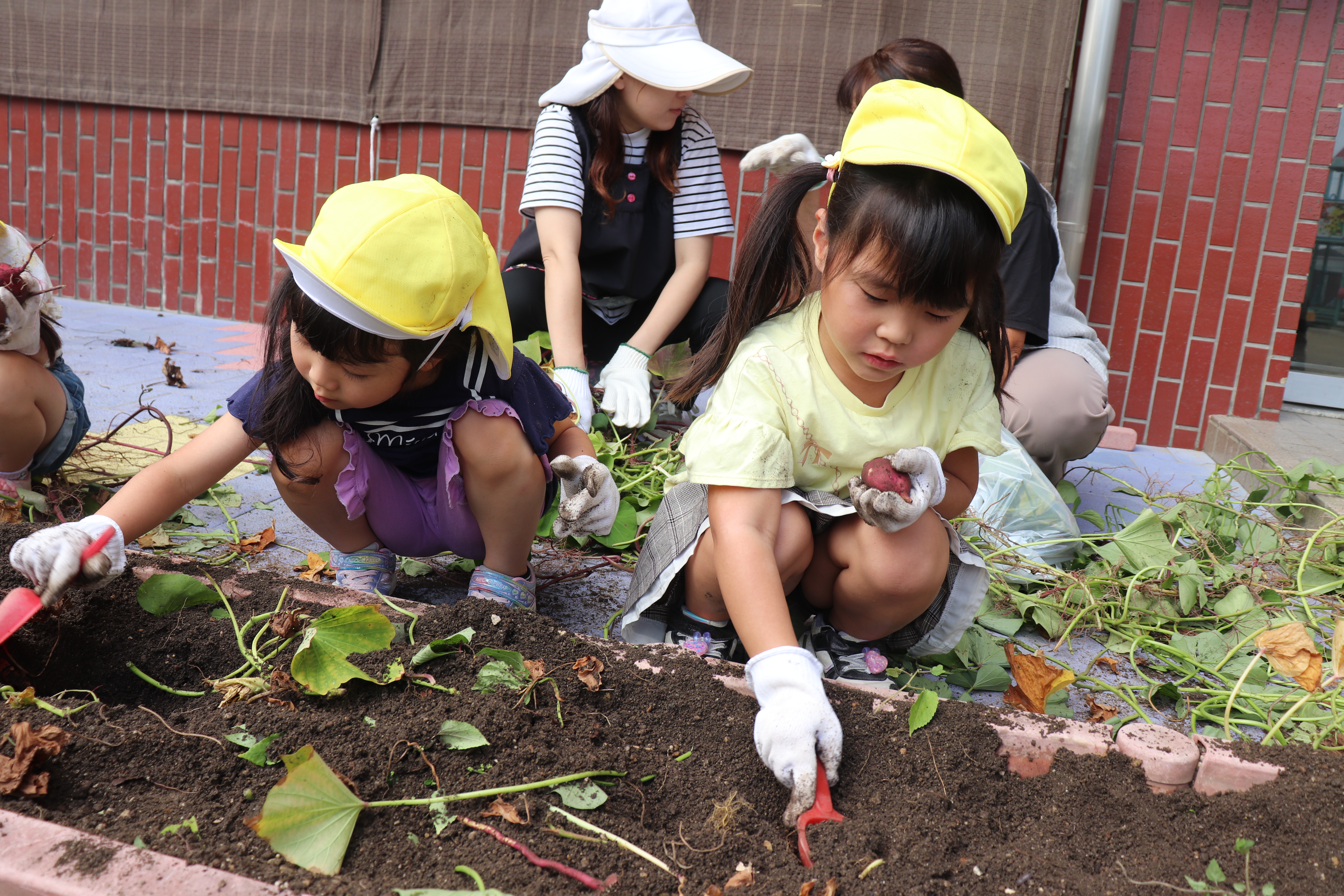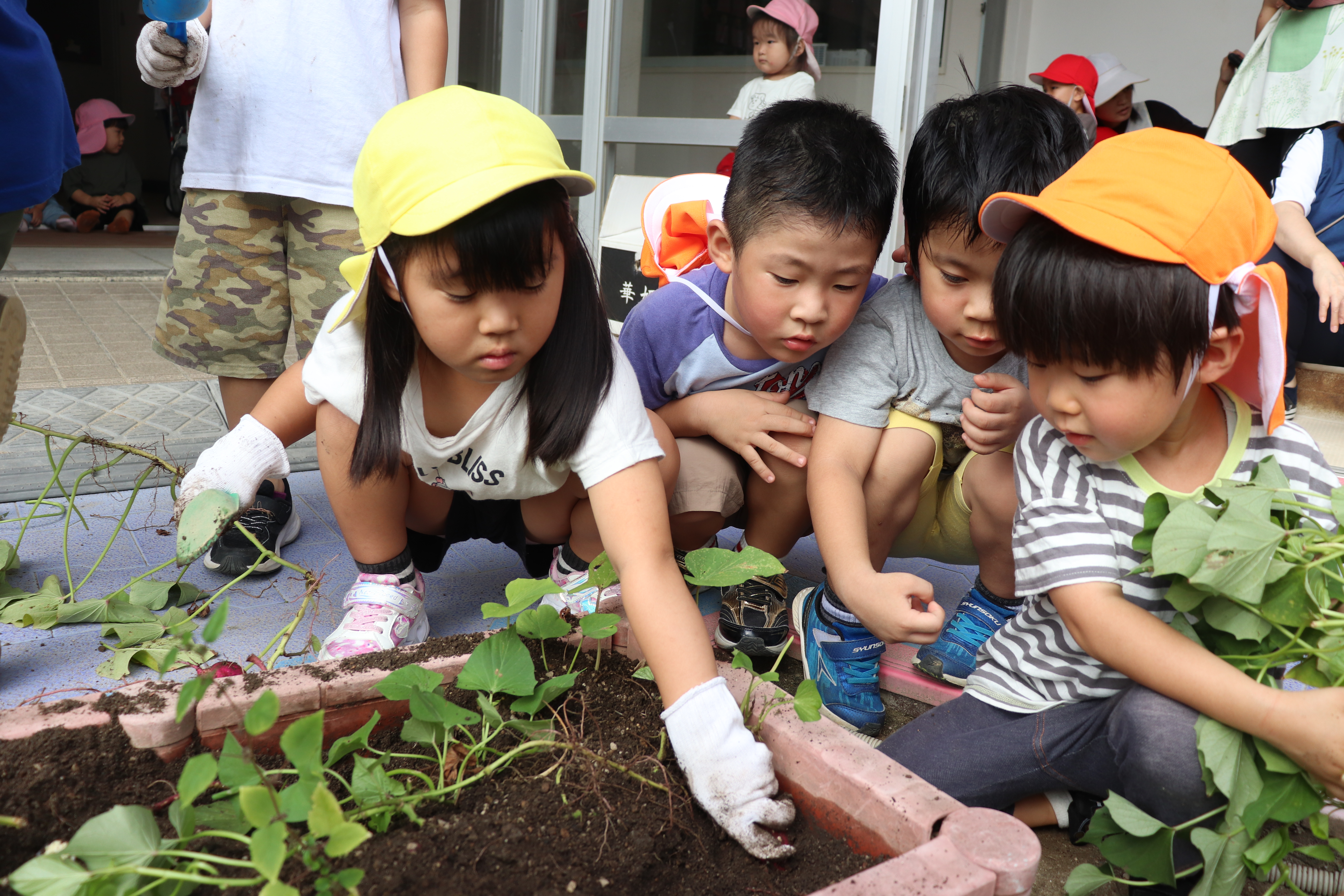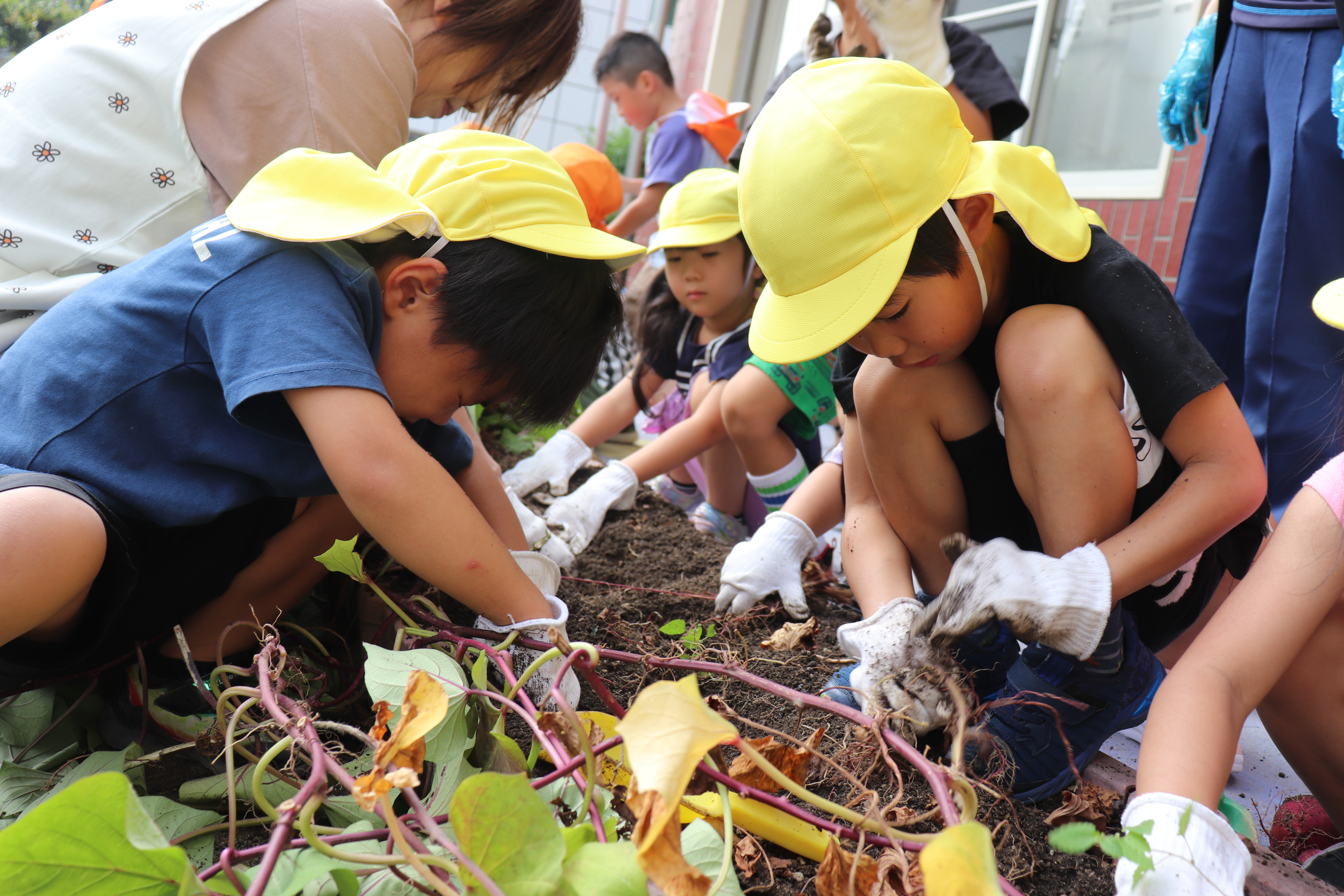 春に植えたさつま芋が、順調に!?育ったので、みんなでお芋ほり~♪土を掘って、さつま芋がちょこっと顔を出しているのを見つけると、「お芋あった~!!」と一生懸命に土をかき分けて、お芋ほりを楽しんでいました!!小さいお芋や大きなお芋と色々な形をしたお芋がたくさん獲れました(*^_^*) 今度は、収穫できたお芋を使って、クッキングを楽しみたいと思います♪